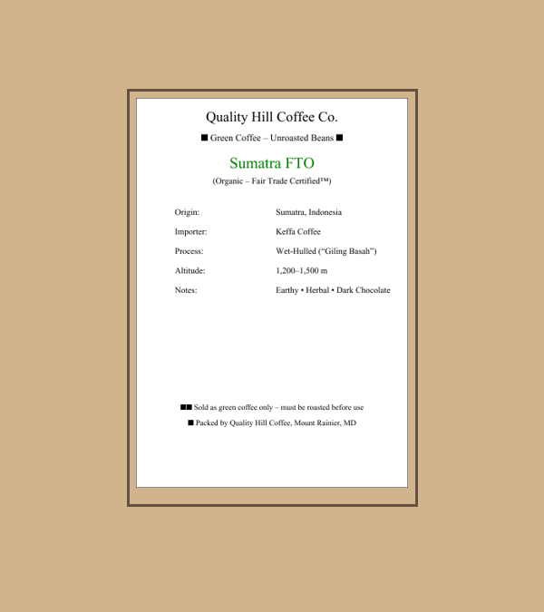• Sumatra FTO Green Coffee Beans – Fair Trade Organic, Unroasted 5 pounds $55.00